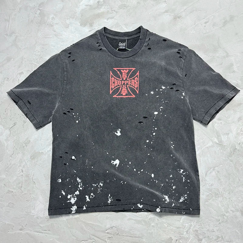Classic Orange Cross Logo Print West Coast Choppers T Shirt Men Women Vintage Washed Black Splashed Ink T-Shirt Damaged Hole Tee